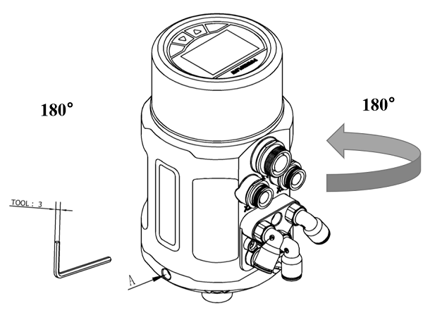 將定位器與閥門連接之后,定位器可與閥門之間做角度調整。若需要調整定位器操作界面角度,松開A處的內六角緊定螺釘后,順時針或逆時針180°范圍內調整到需要的角度,再擰緊緊定螺釘。